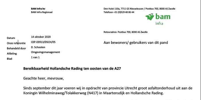 - Bewoners hebben een brief ontvangen betreffende de situatie. Zie in de rechter kolom.