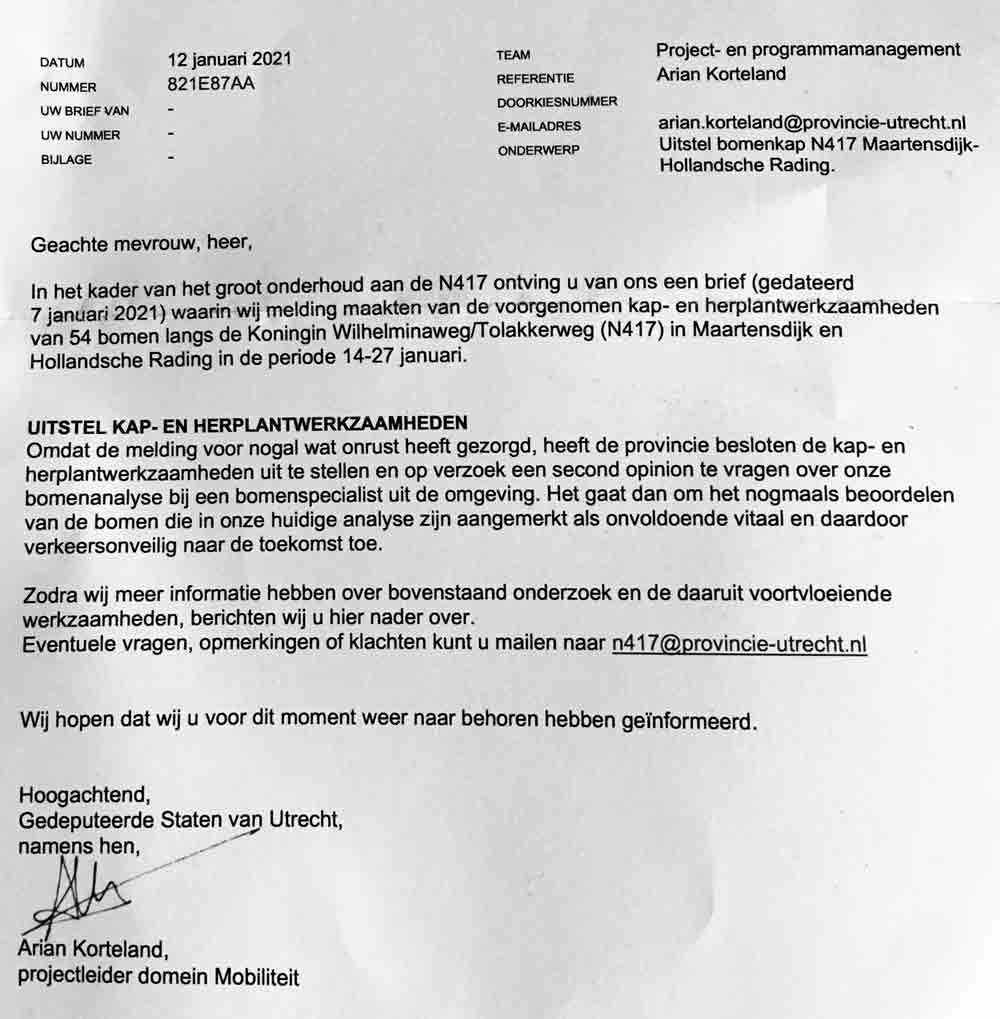 De provincie heeft als volgt gereageerd: “Voor wat betreft het kappen van niet vitale bomen langs de N417 hebben we de werkzaamheden van komende donderdag en vrijdag stopgezet. We weten dat de bomen voor de omgeving heel belangrijk zijn en nemen daarom nogmaals extra tijd voor meer draagvlak. Ook hebben wij vanuit de omgeving een extra bomenspecialist aangedragen gekregen. We hebben afgesproken om onze bomen-analyse, opgesteld door onze bomenspecialist, samen met hem te bespreken en te bekijken waar eventuele knelpunten zijn.”