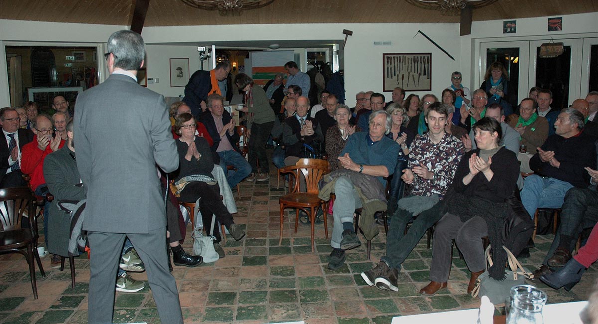 Veel bewoners uit Holl. Rading, maar ook belangstellenden uit Hilversum en Maartensdijk zorgden voor een uitpuilende zaal in De Paddenstoel. En zij kregen “waar voor hun geld”, namelijk standpunten van de lijsttrekkers van alle politieke partijen uit de gemeente De Bilt op een zevental stellingen.