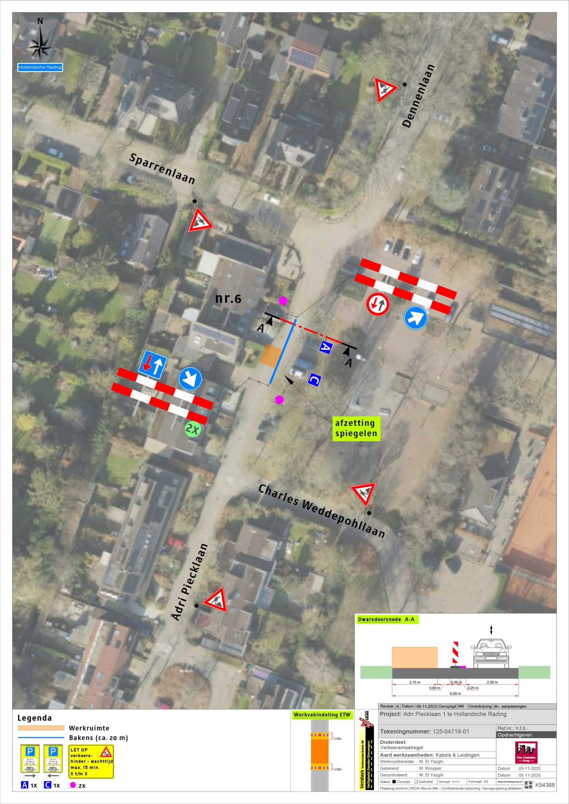 De werkzaamheden vinden plaats ter hoogte van Adri Piecklaan 1. Voor de uitvoering moet een wegoversteek worden gemaakt. Hierdoor wordt de weg deels afgesloten. Om de werkzaamheden veilig en efficiënt uit te voeren, kan het voorkomen dat het verkeer tijdelijk, gedurende ongeveer 15 minuten, wordt stilgezet. Zie de afbeelding hoe de wegafzetting eruit gaat zien.